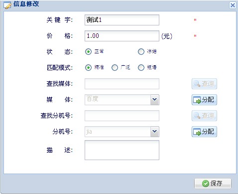 媒体配置关键字设置—根据企业在媒体推广中设置的关键字进行系统设置1.例如:进入“关键字设置”界面,点击“新建关键字”,进行新建关键字,如下图: 新建关键字时添加“关键字”,选择好要绑定的商户,媒体,工作组。 2. 媒体配置完成后,进入“商户”登陆平台,在“我的资料”中点击“生成呼叫代码”如下图: 复制 JS代码,将代码设置到商户要宣传的网页中即可实现媒体配置 3. 点击“查看”,可以看到关键字的详细信息。如下图: 4. 点击“修改”,修改关键字的信息,点击“保存”。如图 5. 点击“删除”,弹出确认是否删除对话框,点击“确认”则删除,点击“取消”则不删除。如图 6.设置接线员提示音,商户——》基本信息——》编辑——》竞投媒体。如图 (责任编辑:admin) |